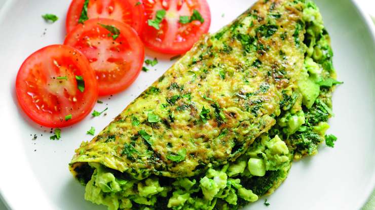 Яйца слегка взбейте с молоком и специями. Разогрейте сковороду с маслом, добавьте шпинат и слегка припустите. Залейте яичной смесью и жарьте под крышкой 3–4 минуты. Готовый омлет подайте с ломтиками авокадо.