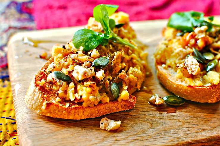 Хлеб слегка подсушите в тостере. Смажьте ломтики хумусом, сверху выложите теплую тыкву. Украсьте семечками и сбрызните маслом.