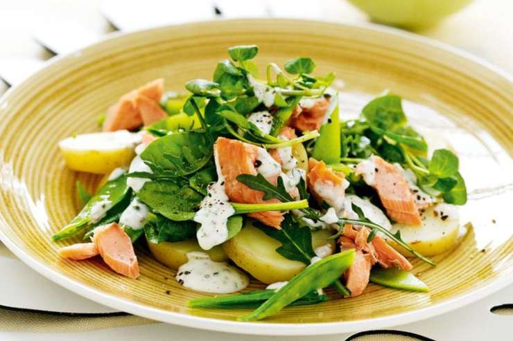 Теплый салат с картофелем, лососем и зеленым соусом