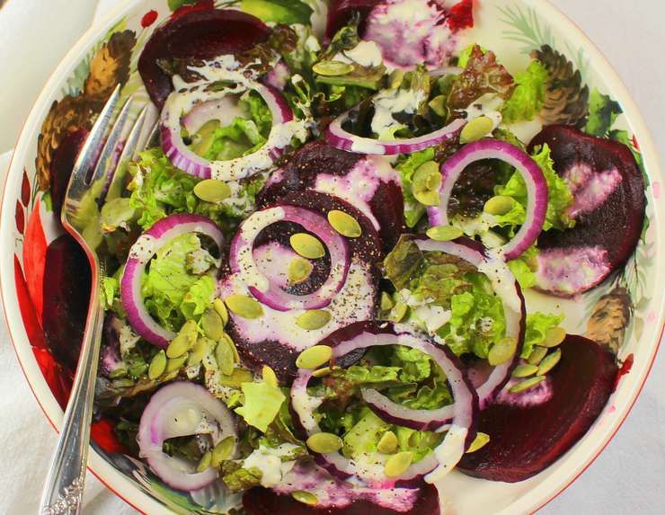 Салат с ростбифом, маринованным луком и запеченной свеклой