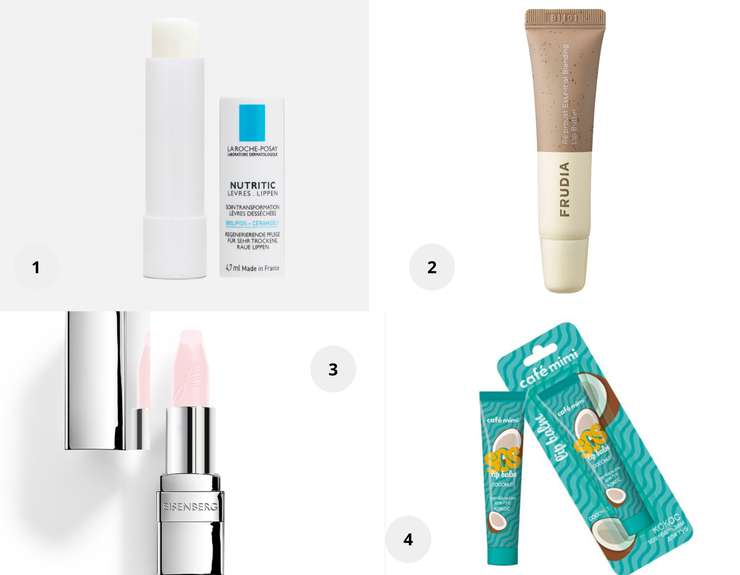 1. La Roche-Posay Питательный бальзам для глубокого восстановления кожи губ Nutritic. 2. FRUDIA баттер для губ «Сила земли». 3. Бальзам для губ «FUSION», Eisenberg. 4. SOS-бальзам для губ «Кокос», Cafe Mimi.