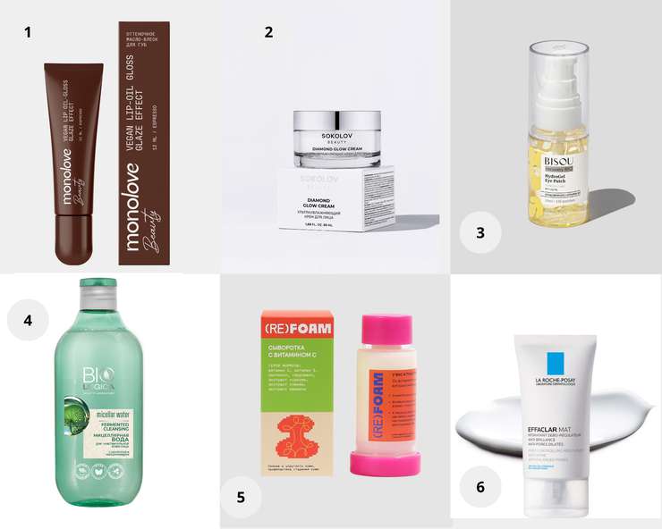 1. Масло-Блеск для губ Vegan Glaze Effect/Espresso, Monolove. 2. Крем для лица ультра увлажняющий с коллагеном Diamond Glow Cream, SOKOLOV BEAUTY. 3. Экспресс-уход Гидрогелевые Патчи для глаз, BISOU. 4. Мицеллярная вода для чувствительной кожи лица «Fermented cleansing», BIOLOGICA. 5. Сыворотка с витамином C, (RE)FOAM. 6. Матирующий крем Effaclar MAT+, La Roche-Posay.